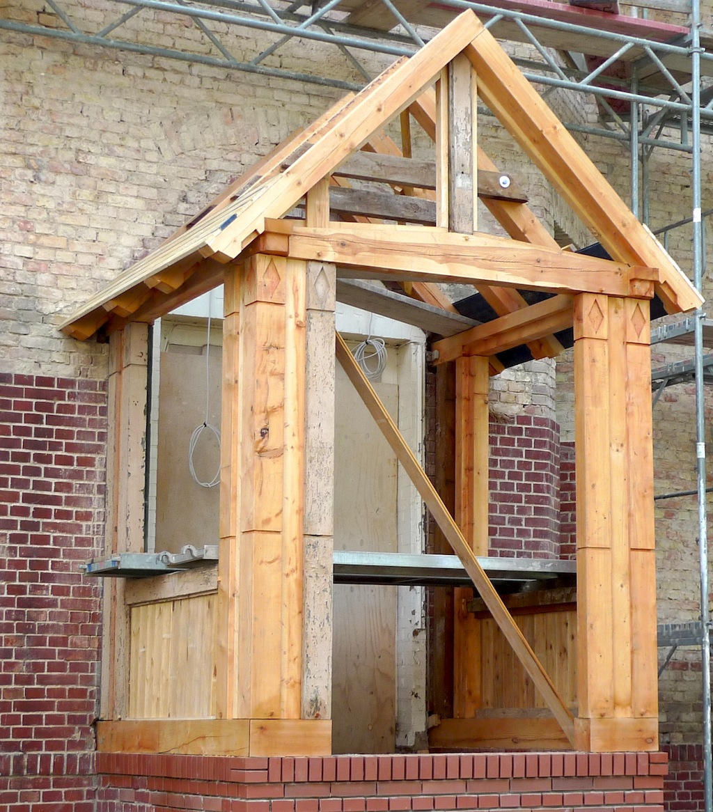 Unsere Zimmermänner garantieren nicht nur, daß unsere Rohbauten stabile Dachkontruktionen erhalten, sondern sie garantieren einen schnellen und flexiblen Ablauf in allen Bauphasen, ob es der Bau von Schalungen ist, das Anfertigen von Abfangungen und Bauhilfskonstruktionen oder wie im Bild, das Richten von klassischen Bauteilen (Krankenhaus West in Stralsund). Schön, daß der ökologische Baustoff Holz wieder mehr und mehr an Einsatz gewinnt. Weitere Informationen zum Zimmererhandwerk finden Sie in diesem Wikipedia-Artikel.